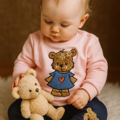 بلوز شلوار نقلی نوزادی طرح خرس سرشانه دکمه خور دخترانه ۶-۱۲ ماه